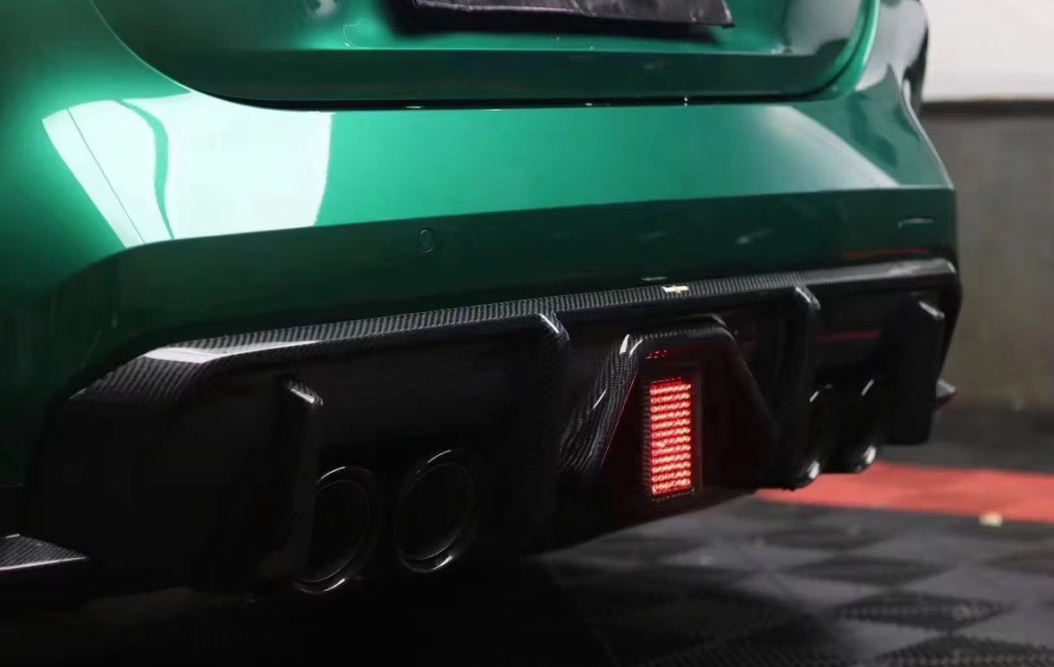 Enhance your BMW G80 M3 or G82 M4 with our Carbon Fibre Diffuser LED Track Light. Made with expertly crafted carbon fibre material, this track light will provide a sleek and modern look to your vehicle. The LED lights will also provide optimal visibility and safety while driving. Upgrade your car's appearance and functionality with our high-quality track light.